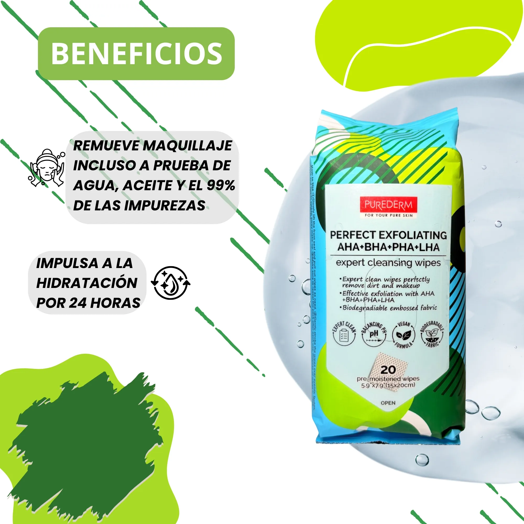 Las toallitas Expert Clean eliminan la suciedad y el maquillaje a la perfección. Exfoliación eficaz con AHA+BHA+PHA+LHA. Tejido con relieve biodegradable.